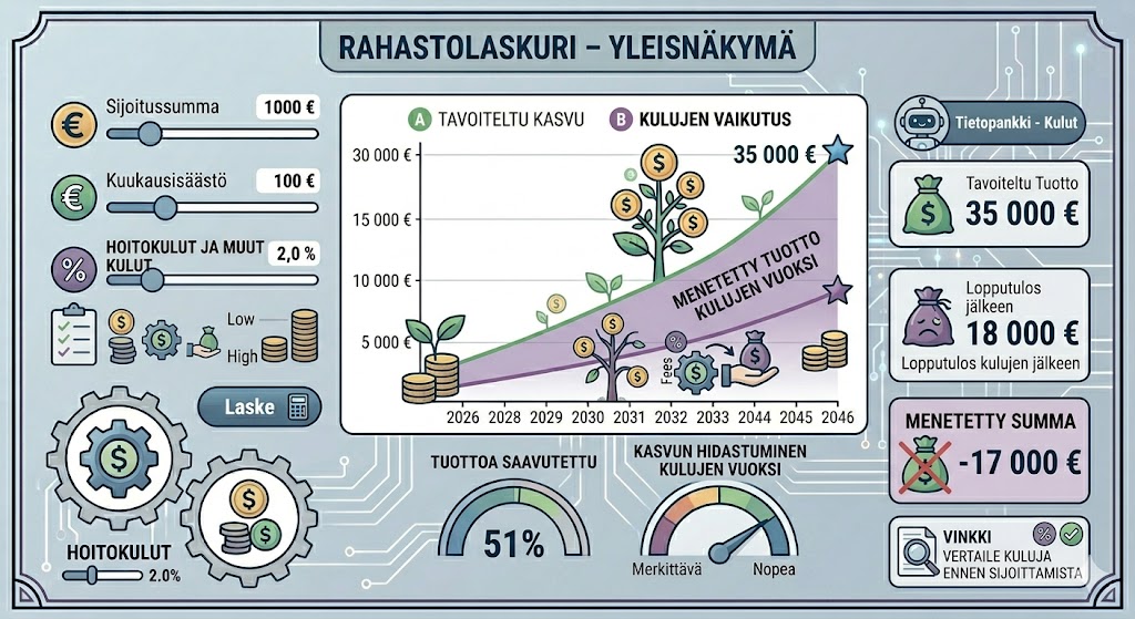 Kun käytät työkalua kuten rahastolaskuri Suomessa, on tärkeää ottaa huomioon pääomatuloverotus. Suomessa sijoitusrahastojen arvonnoususta maksetaan veroa vasta kun osuudet myydään. Laskurit tarjoavat usein mahdollisuuden laskea joko bruttotuoton tai nettotuoton verojen jälkeen. Tämä on kriittistä, jotta tiedät todellisen käytettävissä olevan summan säästöajan päättyessä.